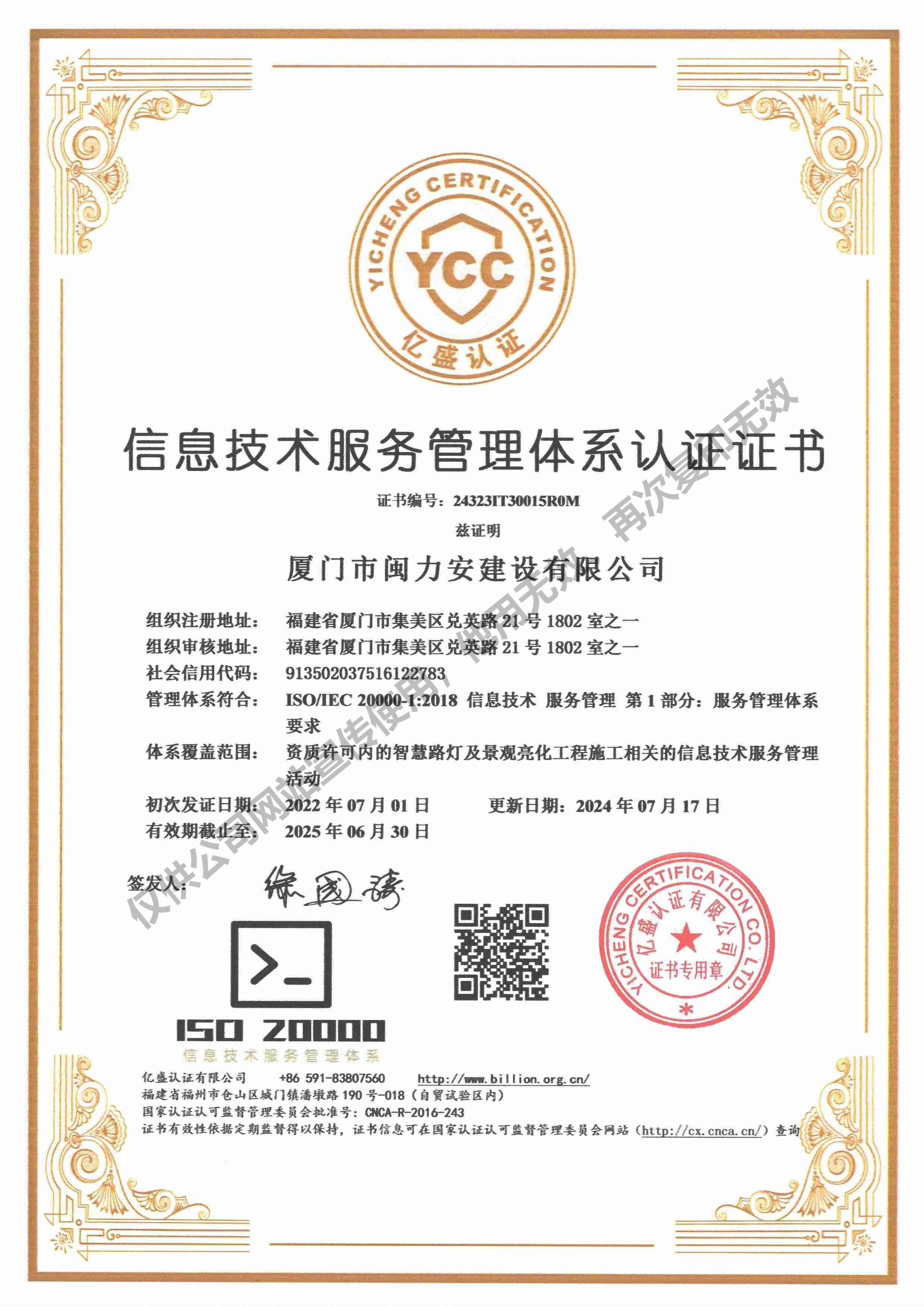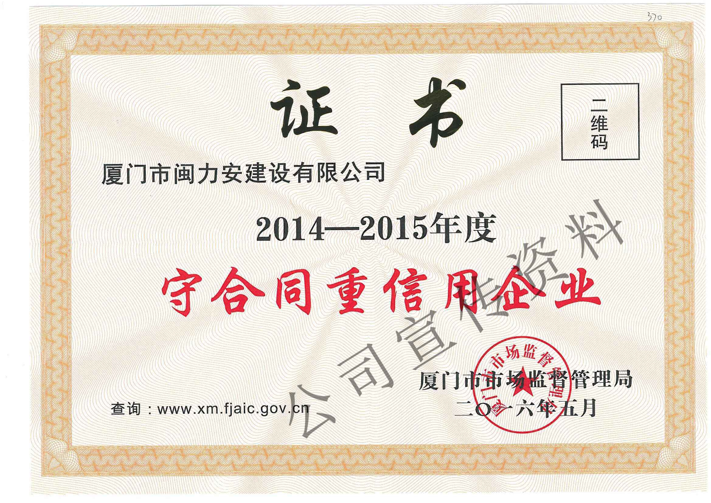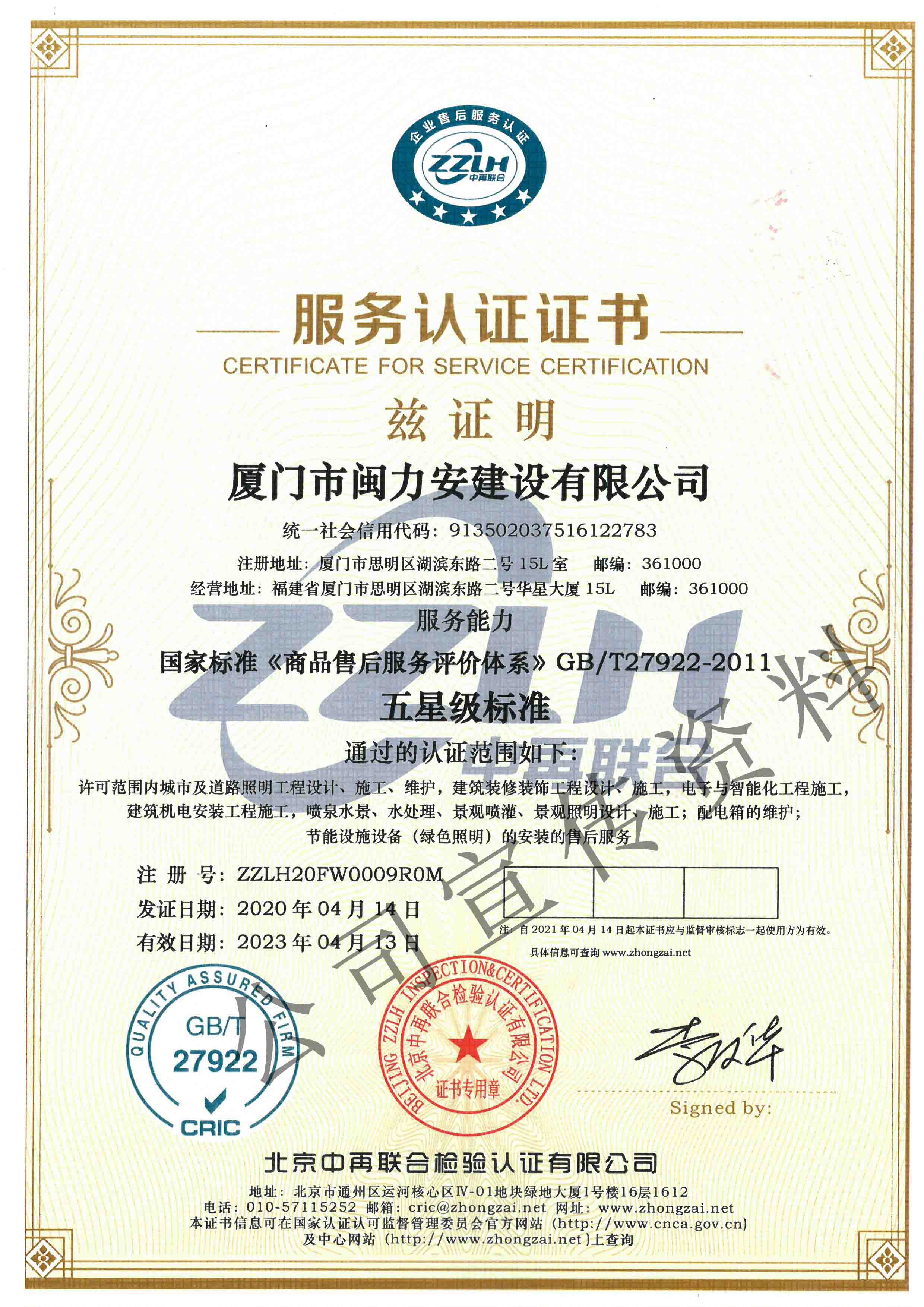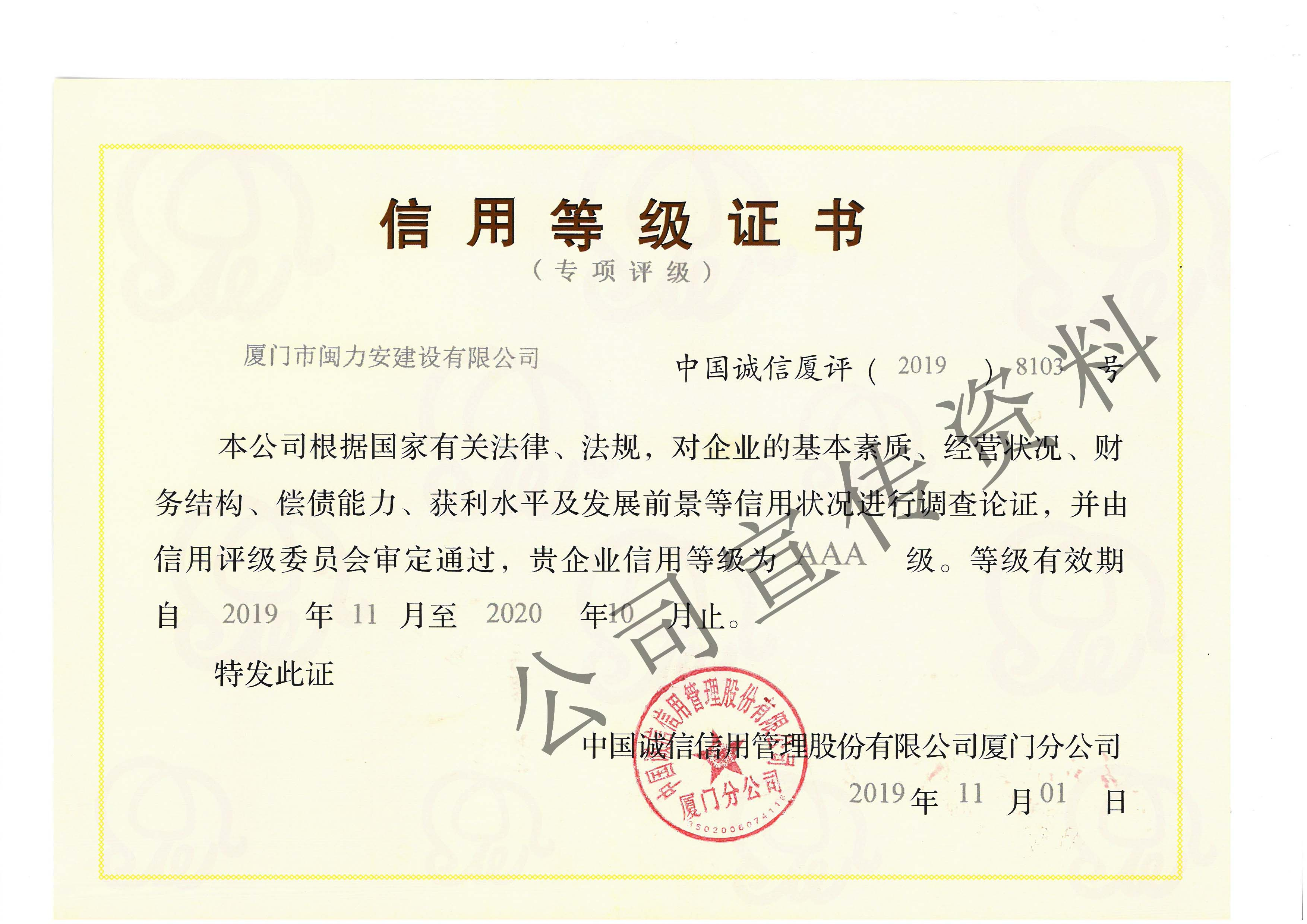 廈門(mén)市閩力安建設(shè)有限公司成立于2003年,公司取得市政公用工程施工總承包貳級(jí)、建筑裝修裝飾工程專業(yè)承包壹級(jí)、城市及道路照明工程專業(yè)承包壹級(jí)、電子與智能化工程專業(yè)承包貳級(jí)、消防設(shè)施工程專業(yè)承包貳級(jí)、電力工程施工總承包叁級(jí)、建筑機(jī)電安裝工程專業(yè)承包叁級(jí)、輸變電工程專業(yè)承包叁級(jí)、環(huán)保工程專業(yè)承包叁級(jí)、照明工程設(shè)計(jì)專項(xiàng)甲級(jí)、建筑裝飾工程設(shè)計(jì)乙級(jí)、施工勞務(wù)等資質(zhì)的綜合型企業(yè),公司于2013年通過(guò)了ISO9001質(zhì)量體系認(rèn)證,ISO14001環(huán)境管理體系認(rèn)證,OHSAS18001職業(yè)健康安全管理體系認(rèn)證。